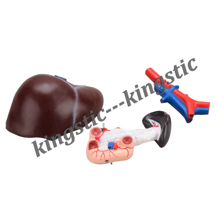 This model shows human liver,pancreas and duodenum position.Duodenum is the first section of the small intestine, a large C shape around the pancreas. Internal view, it also helps to lean the closely connection between them,the pancreas located below the liver, with the dual function of exocrine and endocrine . Model is dissected into 3 parts and PVC on white base.